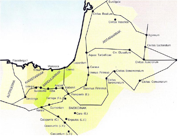 Gogoan hartzeko beste datu bat: erromatar denborako hilarri zizelkatuak, latinez idatziak baina euskara aztarren garbiekin, hain justu ere akitaniarren lurrean azaldu dira, baina ez baskoien eremuan. Zergatik hori? Agian, lurralde horretan zegoelako hiri-multzo handiena ere –Novempopulania zeritzana–.