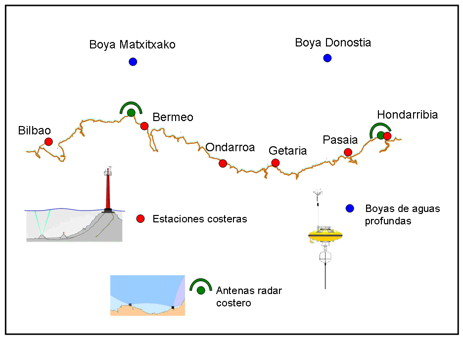 Las boyas de aguas profundas se encuentran instaladas a 10 millas de distancia de cabo Matxitxako (Bizkaia) y a 17 millas de la costa donostiarra. Estos equipos recogen, además de todos los parámetros meteorológicos, información de detalle sobre el oleaje y la salinidad a distintas profundidades. Los radares de alta frecuencia, por su parte, miden las corrientes marinas de la superficie. Las antenas de este sistema se encuentran en Bermeo y Hondarribia y cubren un área de unos 10.000 km2.