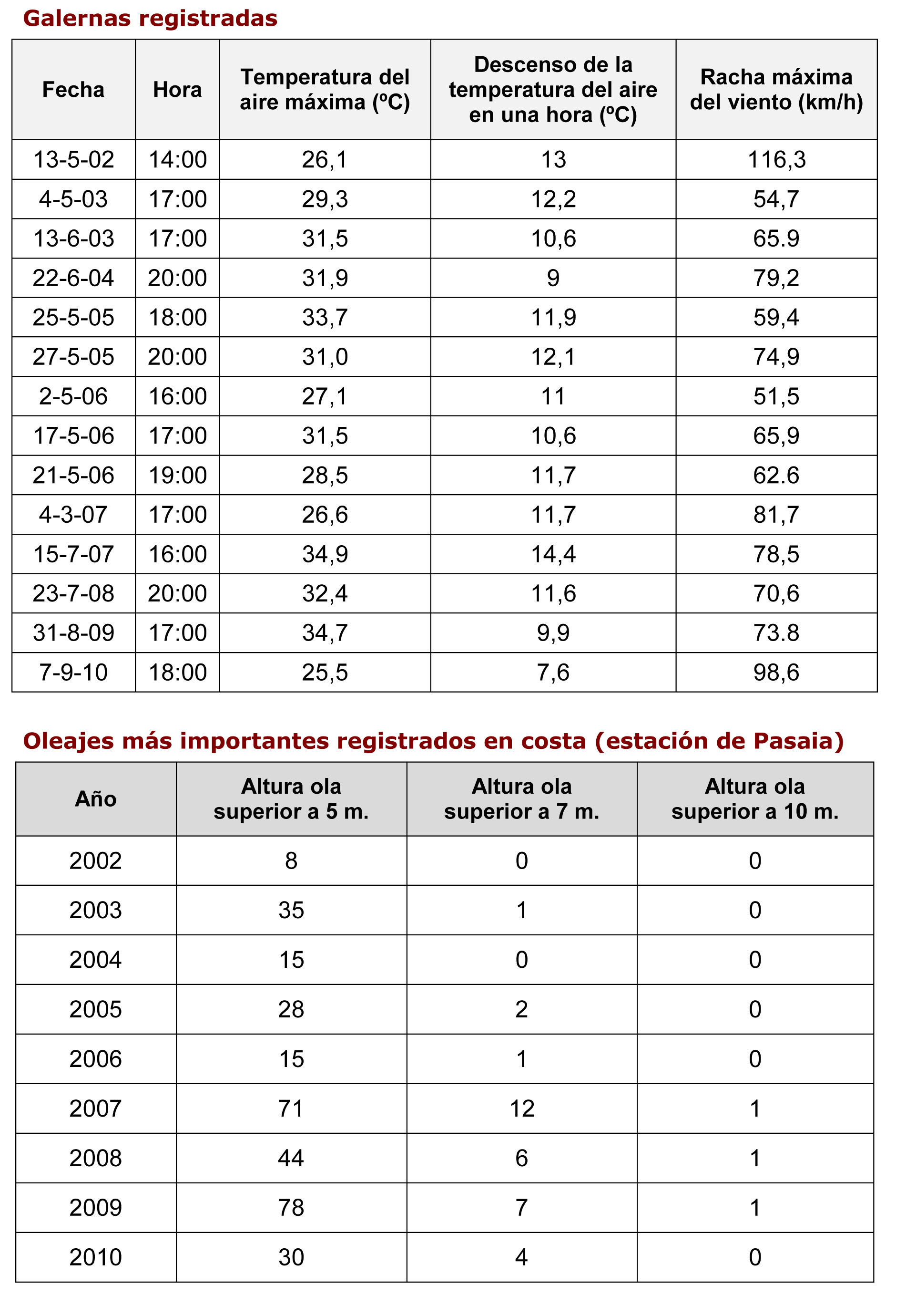 En cuanto a los episodios de oleaje más importante, los años 2007, 2008 y 2009 registraron el mayor número e intensidad de estos fenómenos. En ese ciclo se contabilizaron tres temporales con olas de más de 10 metros de altura medidas en costa (estación de Pasaia) además de 25 temporales con olas de entre 7 y 10 metros. Por contraste, los años 2002 y 2004 fueron los de oleaje más suave.