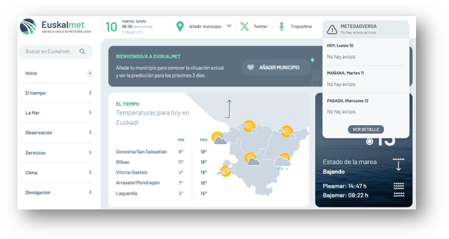 Euskalmet webguneko denbora errealean datuei sarrera izan dezakezu, behaketa atalean: