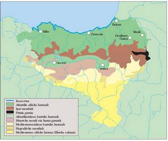 Aipatutako inguru baldintza horiek direla eta, iparretik hegora eskualde bereizietan