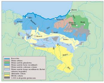 marga, harea eta gai multzoak, ibai sareak ekarritako sedimentuz estaliak batzuetan.