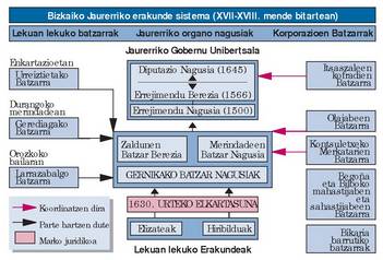 • Lekuan lekuko erakundeak Biztanlegune bakoitzak, nahiz hirietakoek (hiriak berak) nahiz nekazari girokoek (elizateak, kofradiak, parrokiak e.a.) bere erara antolatzen zuten aginpidea; horretarako bideak udaletxeak, batzarrak, biltzarrak, kontzejuak edo hermandadeen batzarrak (Araban) izan ohi ziren. Herrialde bakoitzeko instituzio orokorrak eta erregearen zenbait ofizialek (korrejidoreak, baileak…) bazuen, hala ere, erakunde horiek babesteko noski, baina begiratzeko eta ikuskatzeko ereahalmena. Hiribilduak zein bere foruaz eta ordenantza bereziez baliatzen ziren administrazioa bideratzeko, nekazari giroko herriguneak, berriz, ohiko zuzenbidea eta ordenantza idatziak erabiltzen zituzten.