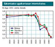 Hilkortasunak mendearen lehendabiziko hamarraldian egiten badu behera, jaiotza tasak ez du maila beretsua izango XX. mendearen bigarren laurdena arte. Nahiz eta Gipuzkoan jaiotza tasaren beherakada 1880an kokatu, lurralde horretako trantsizio demografikoa modu bare eta leunean hasi izan balitz bezala, Bizkaiak eta Arabak, ugalkortasun maila handiak dituzte mende honen hasiera arte.