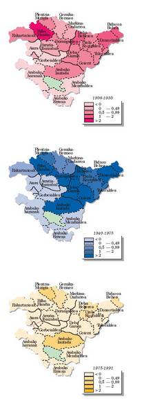 Hilkortasunaren tasaren beherakada bost urtero ehuneko 10az gaindikoa izan zen, krisialdiko urtetan (1920ko gripe epidemian, 1936-39 arteko gerrate zibila) eta 1956-60ko bosturteko bitartean ezik, azken aldi horrek bigarren etorkinaldiarekin bat egiten duelarik. Urte horietan izandako etorkinen bigarren oldea, jaiotza tasen gorakadan islatzen da, hilkortasunaren beherakada eten eta gorakada txikia ere antzematen delarik tasa gordinetan.