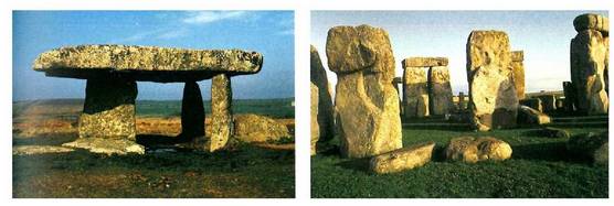 Ezkerrean, Lanyon Quoit-eko dolmena (Cornwall, Ingalaterra). Eskuinean, Stonehenge-ko megalito multzoa (Ingalaterra).<br><br>