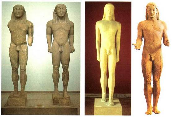 Kouros izeneko izeneko irudien edo mutil irudien bilakaera : ezkerrean, Egiptoko eskulturaren eragin nabarmena erakusten duten bi kouros ; erdian, irudi estilizatuagoa, baina besoak zuzen, soinari atxikita dituen kouros bat ; eskuinean, besoak aurrerantz luzatuta eta gorputza eta anatomia xehetasun errealistagoak dituen irudia.<br><br>