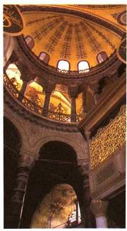 Konstantinoplako Santa Sofia elizaren barnealdeko ikuspegia. Argazkiaren ezkerraldean tinpanoko petxinak ikusten dira, leihoez hornituak, eta eskuinaldean, berriz, erdiko kupula handiari eusten dioten albo bateko kupula erdiak.<br><br>