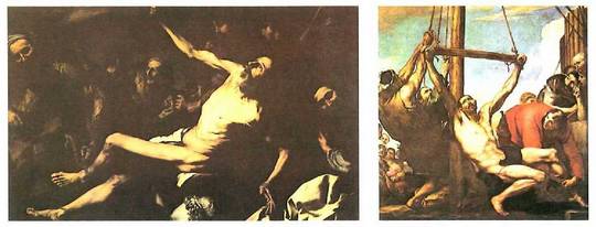 Riberaren bi koadro, santuen martirioari buntzkoak eta 1639 ingurukoak biak. Ezkerrean, San Bartolomeren martirioa (Pitti galeria, Florentzia). Eskuinean, Filipe santuaren martirioa (Prado museoa, Madril).<br><br>