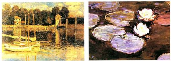 Calude Moneten bi koadro. Ezkerrean, Askaria lorategian (1872). Orsay museoa, Paris. Eskuinean, Amsterdameko ikuspegia (1871).<br><br>
