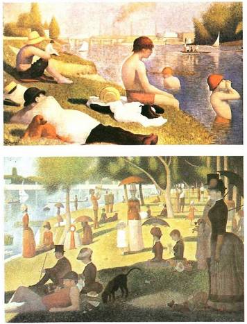 Georges Seuraten bi maisulan. Goian, Bainua Asnieresen (1883-1884 ; National Gallery, Londres). Behean, Igande arratsaldea Grande Jatteko uhartean (1884-1886, Chicagoko Arte Institutua).<br><br>