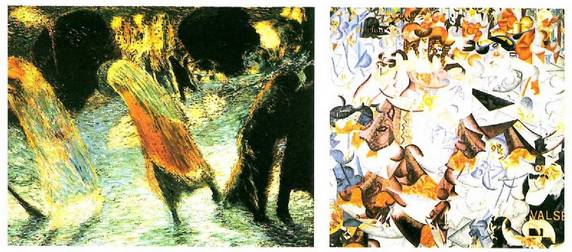 Futurismoko lehen belaunaldiko bi margolan. Ezkerrean, Garraren Antzerkrko irteera (l9O9). Bilduma pribatua. Eskuinean, Severiniren Tabarineko hhieroglifo dinamikoa (1912). Arte Modernoko Museoa, NewYork.<br><br>