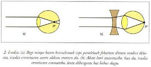 Miopia. Arestian esan den bezala, begi perfektu batek erretinan bertan eratzen du infinituko puntu baten irudia. Batzuetan, ordea, infinituko izpi horiek ez dira erretinan fokatzen, haren aurreko beste punturen batean baizik. Kasu horretan, begia miopea dela esaten da, edo miopia akatsa duela. Miopia zuzentzeko infinitutik datozen izpiak zabaldu egin behar dira begira heldu baino lehen, azken irudia erretinan era dadin. Horretarako, begi aurrean lente dibci gente egoki bat ipini behar da, 2. irudian ikus daitekeen bezala.