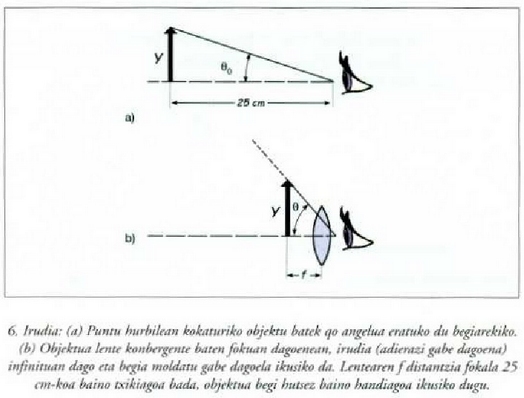 Oraingoan, baina, objektua begiaren puntu hurbilean ipini ezin denez, objektiboarekiko eratzen duen angelua eta begiarekiko eratuko duena (0,), berdinak direla pentsatuko da. 9. irudiaren arabera,
