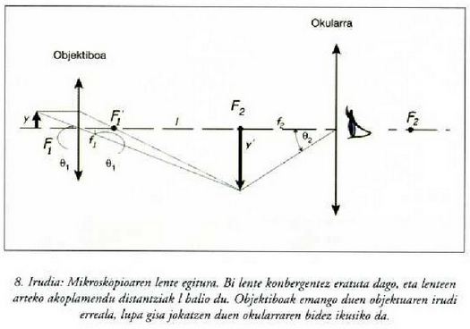 Mikroskopioa da objektu oso txikiak begiratzeko erabiltzen den tresna optikorik ezagunena. Nahiz eta mikroskopioa sistema nahiko konplexua izan ohi den, bi lentez osaturiko sistema gisa aztertuko da hemen: aurrealdeko lentea objektiboa izango da, eta atzekoa, okularra. Objektiboaren eta okularraren arteko egokitzapena 8. irudian ikus daitekeen moduan egiten da, hau da, lente objektiboaren irudi fokua, , eta okularraren objektu fokua , 1 tarteaz banaturik daude. Objektiboaren foku distantzia, okularrarena baino askoz txikiagoa izan ohi da.
