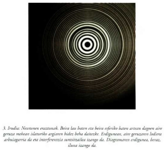 Horretarako, beirazko bi gainalde behar dira elkarri ukitzen diotela, bata laua eta bestea esferikoa. Bi gainalde horien su-tean geratzen den aire geruza mehean argia islatzen denean ikus daiteke Newtonen eraztunak. Bi gainalclcen ukimen puntuen inguruan beira-airea gainaldean islatutako izpiaren eta beheko airea beira gainaldean islatutakoaren arteko ibilbide diferentzia ia hutsa izango da, edo gutxienv, argiaren uhin luzeraren aldean kontuan ez hartzekoa. Horren o ndorioz. b i uhin horien arteko interferentzia erabat desegilea izango da, beheko airea beira gainaldean islatutako izpiak duen 18(l°-ko fase aldaketa dela-eta. Horregatik eremu hori iluna izango c1:t (diagramaren erdigunea). Lehenengo lerroa • distiratsua, baldintza hau beteko ehien erradiorako azalduko da: dagokion ibilbide diferentziak emango (loen fase diferentziak 180 ° - koa izan behar du. Kontuan hartu behar da fase aldaketa hori lehenago aipatu olen islan gertatzen den beste aldaketari hatu behar zaiola; 360 -ko fase aldaketa (fase aldaketa balio gabearen baliokide) izango da guztira. Beirazko gainalde esferikoaren makurdura erradioa ezagutuz gero. dia;gnunako zerrenden sorleku r,u, tca afera daiteke.