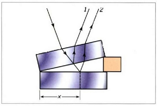 4. Irudia: Beirazko bi xaflaren artean dagoen eta falka itxrr»r duen aire geruza mehea. Argiok perpeudrktdarkr erasotzen duela suposatuz, izpien ibilbideen diferentzia irudiko x distantziaren proportzionala izango da. Goruk l (gorrenoz, zerrenda dntnntsrrak eta ihiak iknsrko dim n,rrvlaka.