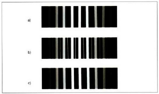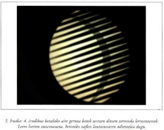 Demagun beirazko bi xafla lau daudela, -i. irudian azaltzen den moduan jarrita. Bi xatlen arteko aire geruzak -ziri itxurakoa- islaren bidez eragiten clituen interferentzia lerroak 5. irudian ikus Gaitezke. Irudian ikusten diren lerroak zuzenak (lira erabilitako beirazko g ainaldeak lauak baitira. Halakoetan, xatl:tk optikoki lauak direla esan ohi da. Hau da. interferentzia zerrenden itxurak xaflen lautasun maila neurtzen du. Adibide gisa. f. irudiko ziriaren antzekoa eratuz kokatutako beirazko bi xafla arruntek eragiten duten diagrama 6. irudian ikus daiteke. Ikus daitekeenez kasu horretan lerro diagrama erabat irregularra da: hortaz, erabilitako xaflak ezin dira optikoki Luiak izan.