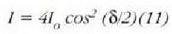 (9) formula aztertuta, ikus daiteke uhin erresultantearen anplitudea dela. Horren gehieneko balioa izango da uhinak fasean daudenetan , eta baliogabea uhinen arteko fase aldea 180°-koa denean Intentsitatea anplitudearen koadroarekiko proportzionala denez, P puntuko intentsitatea hau izango da: