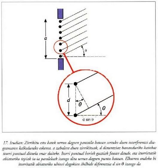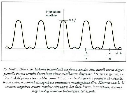 eta berriz, posizioan zirrikituetako batek (berak soilik) sortuko lukeen intentsitatea den. 25. irudia aztertuz gero, erdiko difrakzio gehienekoak 19 interferentzia gehieneko dituela ikus daiteke, alegia erdiko interferentzia gehienekoa eta horren alde banatara beste bederatzi gehieneko. Zergatik kopuru hori? Hamargarren interferentzia gehienekoari dagokion q angelua honela lortu beharko litzateke: baita. Baina posizio hori lehenengo difrakzio gutxinekoarekin bat dator eta ezin izango da ikusi. Horregatik, bederatzi gehieneko ikus daitezke. Hamargarrenak egon beharko lukeen puntu horretara izpiak bi zirrikituetatik baletoz, fasean egongo lirateke eta interferentzia eraikitzailea emango lukete, baina kontua da ez dagoela zirrikituetatik datorren izpirik, puntu hori difrakzio gutxienekoari baitagokio.
