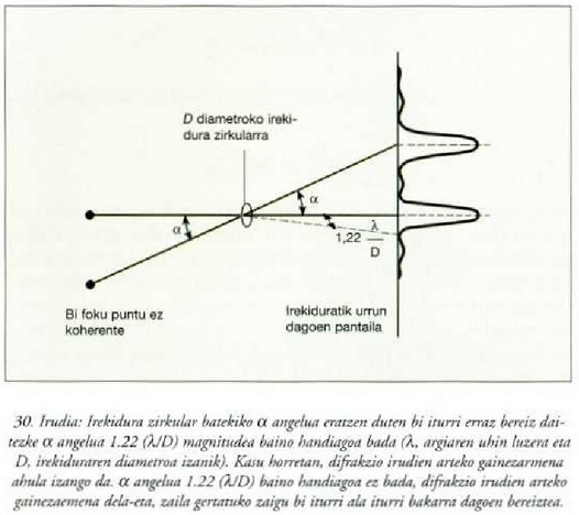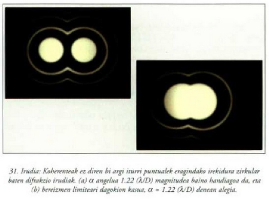 30. irudian, koherenteak ez diren bi iturri puntual eta irekidura zirkular bat adierazi dira; iturriek angelua eratzen dute irekidurarekiko, eta irekiclura eta iturrien arteko distantzia handia da. Irudi berean, Fraunhofer cifrakzioaren intentsitate diagramak azaldu elira. angelua magnitudea baino askoz handiagoa bada, iturri bien difrakzio irudiek gainezarmen txikia izando dute, eta pantailan, bi argi iturri bereiziko dira garbi-garbi.