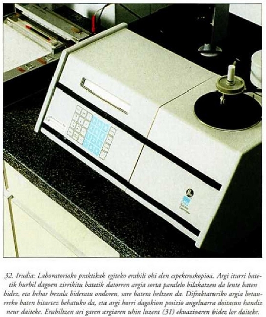 32. irudian, iturri batetik datorren argia aztertzeko difrakzio sare bat erabiltzen duen espektroskopio arrunta ikus daiteke. Iturria, oro har, gas baten atomoak dituen hodia izaten da, helioa edo sodio lurrina adibidez.