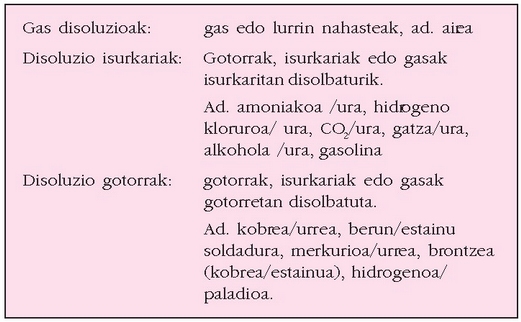 Gas guztiak elkarrekin nahaskorrak dira, hots, denek ematen dituzte disoluzioak. Disoluzio gotorrak ezagunak baldin badira ere, ezagunenak edo arruntenak disoluzio isurkariak dira, eta hauen artean, gotor edo solido bat isurkari batean disolbaturik dagoen kasua.