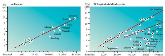 Biztanleen eta bero uhartearen gehieneko intentsitatearen arteko harremana erakusten duten erregresio lerroak, hainbat hirietan eta latitudeetan. ?Th-l hiriaren eta landaren arteko tenperatura aldea da.<br><br>