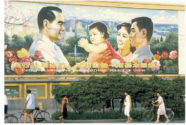 Txinako gobernuak haur bakarraren politikaren baitan antolaturiko kanpaina bateko kartela, Pekingo kaleetan.<br><br>