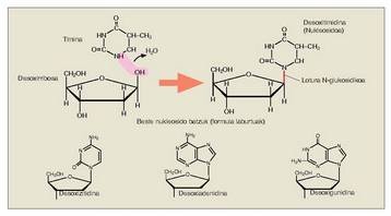 Laboratorioan DNA aztertzean, ondoko osagaiak dituela ikusi zen: azido ortofosforikoa (H 3 , PO 4 ), base nitrogenodun izeneko molekulak eta desoxirribosa (pentosa motako azukrea) (1. irudia).Base nitrogenodunak beren formulan nitrogeno atomo aski izatea ezaugarri duten gai organikoak dira. Bi motako baseak bereizten dira: purikoak eta pirimidinikoak.