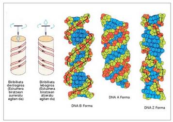 Gaur egun helize bikoitzaren hiru aldaera bereizten dira (7. irudia):B forma: Watson eta Crickek deskribatu zutenarekin bat dator. Baseak plano horizontalean daude eta helizeek erloju orratzen norabidean egiten dute bira.