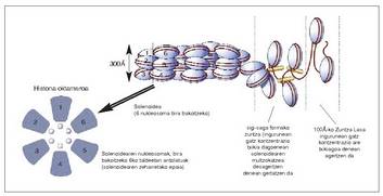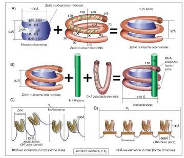 - Bigarren multzokatze maila Zelula eukariotoen (espermatozoideetan izan ezik) nukleoan dauden kromatinazko zuntzei dagokie. Perlazko idun egituraren bihurdura kiribildua da, espira bira bakoitzean sei nukleosoma daude, bakoitzaren H1 motako histonak biltzean elkarri loturik (12. irudia). Beraz, egitura hau era dadin beharrezkoa da H1 proteina.