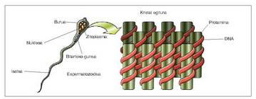 * Egitura kristalinoa: DNA probitaminei lotuta dago. Probitaminak histonak baino proteina basikoagoak dira, eta horregatik indar gehiagoz erakartzen dute DNA (azido bat) eta multzokatzea handiagoa izango da.