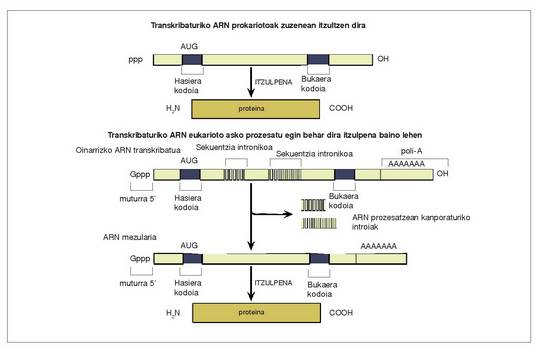 Zelula prokariotoetan, mRNA molekula bakoitza nukleotido segida jarraitu bat da eta proteina baten aminoazido segida kodetzen du; alegia, mRNA transkribatua zuzenean itzultzen da zelula prokariotoetan.Aitzitik, zelula eukariotoetan, gunearen