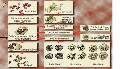 Leukozitoak ehun hematopoietikoetan (hezur muin gorrian, helduetan) eratzen dira.