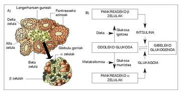 Langerhansen guneek bi eratako hormonak isurtzen dituzte: intsulina (ß zelulek jariatzen dutena) eta glukagoia (a zelulek jariatzen dutena), glukosaren metabolismoarekin zerikusia dutenak (6. irudia, I. taula). Bada hirugarren mota bat ere, zelulak, baina ez da oraindik aurkitu zein eginkizun duten.