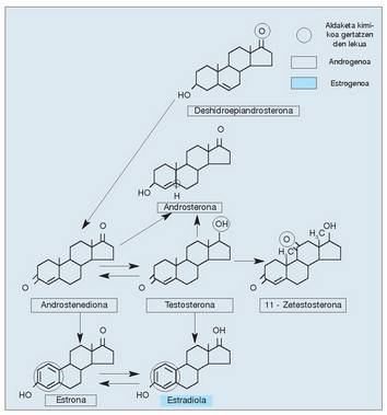 Gonadetan sortzen dira, eta sexu organoen desberdintzeaz, garatzeaz eta jardunaz arduratzen dira (9. irud.). Horrez gainera, badute eraginik sexu ezaugarri primarioen eta sekundarioen mantentzean ere.- Androgenoak. Hauek ere giltzurrin gaineko kortexak isurtzen dituen arren, barrabiletan sortzen da gehiena. Zehatzago, betegarrizko zelulek edo Leydingen zelulek isurtzen dituzte. Ekoizten diren hormonak testosterona, androsterona eta epiandrosterona dira (III. taula).