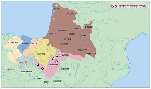 -30 i.: Messalla Corvino-k berriro esku hartu behar du Akitania aldean. Herri parea sortzen dute Pirinioetako mendate biren oinetan: Imus Pyrenaeus (Donibane Garazi) Ibañeta aldean eta Beneharnum (Lescar) Somport aldean. Kantabriako gerrekin erlazionaturik agian.