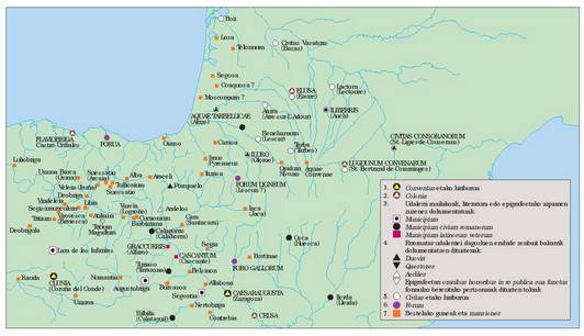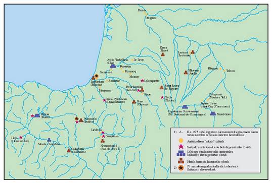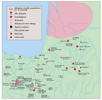 4) Hierarkiaren arabera antolaturiko Eliza oso goiz agertu izana… c) Erromaren ezarpenaren ageriko gertaerak kartografiara eramanez, garbiro ikus daiteke nola eskualde gutxi asko pribilejiatuen ondoan, beste zenbaitetan, bai Pirinioen Iparraldean bai Hegoaldean, erromatar jatorriko aztarnak askoz urriago diren, bai eta elementu hori saihestu edo arbuiatu bide duten eskualdeak ere. Erromaren presentzia, iberiar aldeari dagokionez, Ebroko lerroan eta Asturica-Burdigala bidearen inguruan mamitua izanik (lehenengoan bigarrenean baino areago), bi ardatz nagusi horietara doazen ibai ardatz nabarmenen behe eta erdi ibilguen inguruan agertzen da, indar handiagoz edo txikiagoz, eta gero bakanagoa da goi haranetan edo garrantzi gutxiagoko ibaiadarren luzeran, eta azkenik, guztiz urria da ura Kantaurira isurtzen duten ibarretan eta Mediterraneorako isuraldeko ibai buruetan –estrategiaren ikuspegitik interesgarriak ziren gune bakartu zenbaiten salbuespenarekin beti ere–. Novempopulaniako aldeari dagokionez, egoera berdintsua da, hots, goian aipatu erromatartze ardatz garrantzitsuen ondoan, badira aski presio gutxi jasaten duten eskualdeak, bai eta erromatarren presentzia guztiz bakana edo hutsa agertzen dutenak –hala nola Landesko eskualdea edo Garona eta Aturriren ibaiadarretako goi eta are erdi ibilguetako ibarrak ere–. Kolonizazio presio urriko eskualdeak zehaztu eta haien ezaugarriak aztertzerakoan, beti ere geomorfologiaren eta paisajearen aldetik halakoak ezaugarri jakin batzuren jabe direla egiaztatzen dugu: haran gutxi asko itxi eta sakonek zeharkaturiko lurrak dira, nekazari latinoarentzat hain egokiak ez direnak, eta horregatik, ondoriozta daitekeenez, basoakedo, kasurik onenean, larreak bereturiko alderdiak; azken finean, landu gabeko lurrak eta hein batean menditsuak, autore klasikoek, Vascones deiturarekin elkarturik, saltus izenez izendatzen zituztenak. Saltus hori, bestalde, Pirinioek, beren gailur elurtuekin, aterbe elurtuekin (gogoratu Ausonioren ninguida hospitia) eta herri garaiekin, itsasotik itsasorainoko hesi iragan ezina moldatzen duten baso masa eskergaren –saltus eskerga haren– zati eta luzakin gisa erabiltzen da idazleen testuetan. Saltus hori, beraz, ez da landa lurren ondoko baso txikia, egurra, eraikinetarako zura, ehiza, alhapideak, e.a.. maten dituena, nekazaritza paisaje klasikoan ager delakoaren ezinbesteko osagaia; baizik eta funtsean alde menditsua dena, eremu handia hartzen duena eta bereziki azienda hazten bide duten jende talde desberdinen bizilekua.