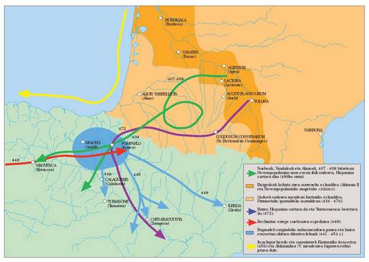 407/409: Suevoak, Alanoak eta Vandaloak, denbora batez Novempopulanian zehar ibili ondoren, Hispanian sartzen dira (409ko urria).