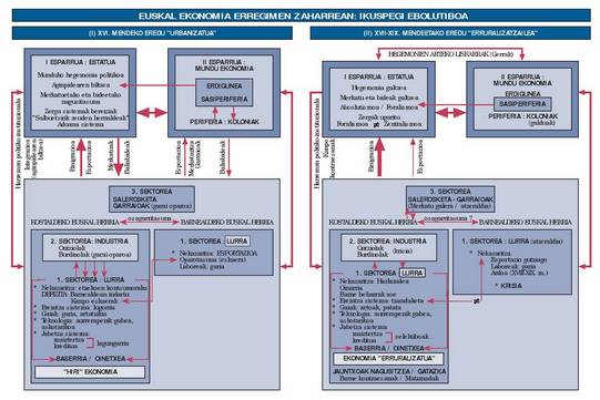 Euskal Herri hezeko gizarteak, 1450. urte inguruan, harreman marko berri baten ezarpena ezagutuko du, ahaidetasuna eta leinu loturak araupetzen zuten hari gailenduko zaiona. Ondoren, zenbait urtetan zehar eta oinordekotzari eutsi ahal izan bazitzaion ere, ez dago inolako zalantzarik mundu berri baten aurrean gaudela, hirietako Ordenantzak, Hermandadeak edo Foruak zuzenduko duen gizarte baten aurrean. Ordutik aurrera, 1789tik 1876. urtera bitarte, euskal gizartea parametro desberdinak erabiliz aztertu beharko da. Eta burgesiaren eredu iraultzaileak, XVIII. mendean sortua, esperientzia horren amaiera ekarriko du. Gure azterketa, bada, bi muga horien barne kokatu behar da.• Euskal Baserri ingurua eta “hiri” ereduaren zabalkundea (1450-1575/ 1620) XV. mendearen bigarren erdialdean, “hiri” funtzionamenduaren eredu zabala indartuko da. Zabalpena eta bitartekotza jarduerak nabarmentzen hasten dira herrialde osoan zehar: “Asko irtetzen dira itsasora…” adieraziko du A. Navagerok 1528an. Herri pobrearen topikoa aberastasun erlatibo bilakatuko da norabide aldaketa honen eraginez. Merkataritza/garraioa, burdingintza eta burdinkiak eta itsasketak garapen maila handia izan zuten. Guztiak dira ezagunak. Jarduera honen antzinakotasunaz hitz egin zuten, besteak beste, Viguerako Foru Nafarrak (1130), Jerezko Korteak (1258), Irun-Urantzu eta Oiartzungo Burdinolen Foruak (1328), e.a. Hala, 1450 eta 1575. urte bitartean euskal burdina ezaguna izango da inperio osoan gure garraiari eta merkatarien eskutik, Ingalaterra, Flandria, Frantzia eta Inperioko beste hamaika itsas portuetara iritsiko baita. Kalkulu bat eginez, XVI. mendearen hasieran 350 siderurgia instalazio izango ziren gure inguruan, Europa osoan kontsumitzen zen burdinaren %10a ekoiztu eta biztanle guztietatik laurden bat, egun osoz zein zati batean, ari zen langintza honetan.