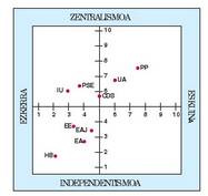 Nafarroako kasuan, 1991ko aldundietarako hauteskundeak argi eta garbi izan ziren nork bere lekua bilatzekoak, eskuin indar guztiak UPNren inguruan bildu baitziren, garaipena eta aginpide forala lehen aldiz lortu zuelarik. Dena den, PSOE indarberriturik atera zen foru parlamentutik, atzera egin zuten erdi moderatu eta abertzaleen kalterako, IUk EEren tokia hartzen zuelarik.• Alderdien sistema: zatiketa eta polarizaioaEuskal eta nafar alderdien sistema anitza eta polarizatua zela esateko bezalako adostasuna baino handiagorik nekez izango da beste ezertan. Esparru hauetan botoen multzo ertaina zuten zazpi alderdi ageri ziren, bi nagusiak ez zirelarik baliozko botoen %49ra iristen EAEn. Bestaldetik tentsio ideologiko larriak zeuden, eta sistemaren aurkakoa zen alderdi bat (HB) botoen %15a baino gehiagorekin ageri zen, bortxa estrategiari ematen zion laguntza ezkutatu gabe bigarren postua noiz iritsiko zebilena. Zatiketa ez litzateke bereziki adierazgarria izango ez baleramatza parean puntako alderdien arteko urruntasun ideologikoa. Urruntasun hori lehia eremuari zegokion eta, gainera, maila eta bide ezberdinak onartzen zituen, giza sistemaren ulermen ezberdinak, autonomia instituzio politikoen onarpena edo ukapena edota nortasuna eta sistema sinbolikoen aurkakotasuna, beste batzuren artean.