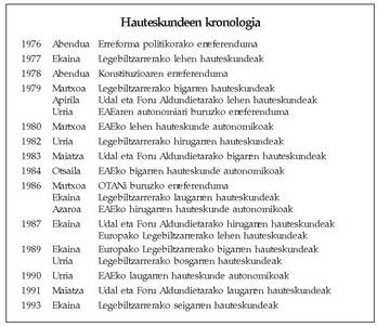 Hauteskundeek beti markatzen diote erritmo bat politikari. Euskal Autonomia Erkidegoari dagokionez (EAE), 1980ko “hasierako” hauteskundeek politikan nork bere lekua aurkitze bat eta EAJ-PNV alderdiak hegemonia izan zuen instituzionalizazio aldi bat zabaldu zuten; aldi horretan mobilizazio bortitza izan zen espainiar zentralismoaren aurka eta abertzaletasun erradikalaren erakunde armatuek jarduera gorena izan zuen, aldi berean, ordea, ETA (pm)ak desegitea erabakitzen zuelarik. 1984ko bigarren hauteskundeak “bitarteko aldikoak” izan ziren, EAJ-PNV alderdi legebiltzarrean eta bere egituran ahuldu izanak laburrarazi zuten legealdi batean lehengo egoera luzarazten zutela. 1986ko hirugarren hauteskundeak nork bere lekua bilatzekoak izan ziren erabat, PNVren zatiketak eta EAren sortzeak eragindako kataklismoa zela eta. 1990eko azken hauteskundeak “bitartekoak” izan ziren berriro ere, eta, seguruenik, 1994an datozenak “berkokapenekoak” izango dira berriro ere, alderdien arteko mugimenduak eta hautes jarreretan aldaketak ikusirik.