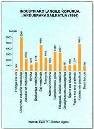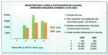 1978.urtean bederatzi enplegatuz gorako lantegi bakoitzeko 83,4 enplegu bazeuden, 1993an 49,8 baino ez. Industria enpleguak 1978-1994 bitarteko urteetan jarduera talde handien arabera zer bilakabidea izan duen ikusteko, jo dagokion grafikora.