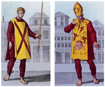 Espainiako Inkisizioak kondenaturikoen sanbenitoak. P. Limbourgen grabatuak, Historia Inquisitions obrarako eginak (Amsterdam, 1692).<br><br>