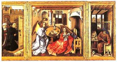 Hogeita bost bat lanen egiletzat hartzen da Flemalle maisua ; horien artean Gizakundea triptikoa da nagusia (1425), mundu sakratuaren eta egunerokoaren arteko bateratzearen erakusgarri bikaina. Ordu arte, nazioarteko estiloaren barruan, mundu aristola-atilcoa erakusten zen ; lan honetan, aldiz, flandriar burges baten etxea erakusten da. Flemalle maisua, Robert Campin izan edo ez izan, ez zen gorteko pintorea, baizik eta hiritar dirudunen nahiak betetzen saiatzen zen burgesa, Andre Afariaren aurrean belauniko jartzen ziren hiritarrena batez ere. Aipatutako lan horretan marraztu zen lehenengo alcliz Gizakundea gela baten barruan, inguruan altzariak dituela ; eta irudi horren alboko gelan San Jose irudikatzen da, lanean. Andre Maria lurrean eserita dago (umiltasunaren irudi), liburu bat irakurtzen.