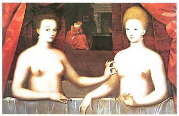 Gabriela d'Estrées eta Villarsko dukesa, Fontainebleauko eskolaren joerei jarraituz egile ezezagun batek margoturiko koadroa.<br><br>