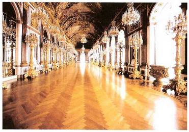 Ispiluen galeria, Herrenchiemsea gaztelua, Baviera. Gaztelu honetan bezala, Versaillesko jauregiko arkitektura moldeak izan ziren Europako jauregi barrokoen eredu.<br><br>