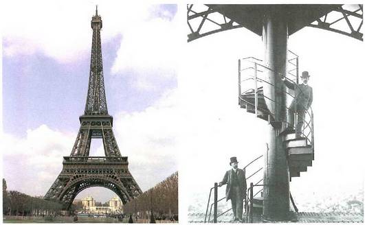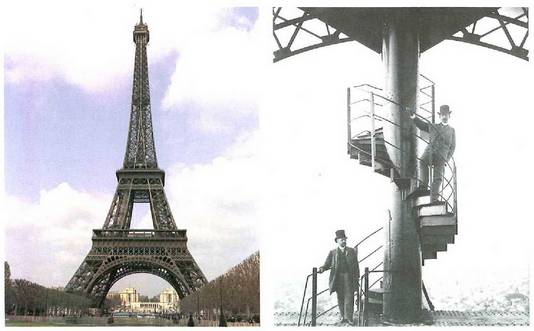 Eiffel dorrearen bi ikuspegi. Ezkerrean, ikuspegi orokorra; eskuinean, Eiffel ingeniaria Adolphe Salles lankidearekin dorrera igota ren sinbolo nagusietako bat da gaur egun.<br><br>