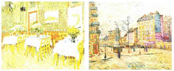 Tanguy Zaharra ospetsuaren dendan, eta Cezanneren obren itzalpean, Signac frantses pintorearen adiskide egin zen. Garai hartan, urrats handiak eta bizkorrak egin zituen Van Goghen arteak : margo argiak erabili zituen loreen eta lore ontzien koadro txiki ñabardura bitxikoak egiteko. Japoniar grabatuen eraginez, Van Goghek askeago eta lasaiago pintatu zuen (Izadr hila lrnaorekin, 1887). Aldi berean, eta Pissarroren aholkuei esker, argiari buruzko teoria berriei esker, eta Signacen lankidetzari esker, margo biziagoak erantsi zizkion ordu arte erabiliak zituen margoei, pintzelkada biziagotu eta zatikatu egin zuen, eta batzuetan bere marrazkien grafismora ere itzuli zen. Garai hartan margotu zituen Montmartreko eta Pariseko ingurtietako ikuspegiek kontrastea sortzen dute bere obrako gainerako lanekin, hain baitira alaiak eta freskoak (jatetxe batera barrualdea, 1887).